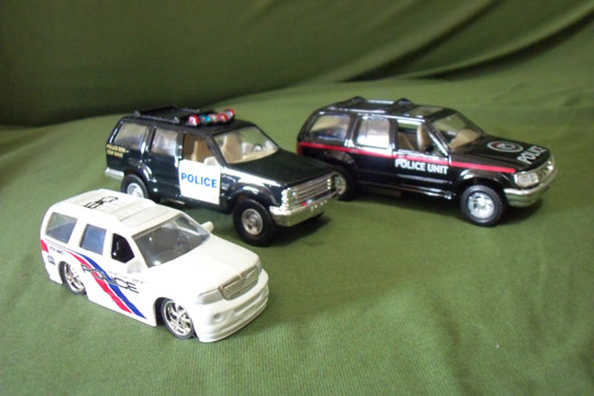 Três exemplos de SUVs muito comuns nos Estados Unidos: Ford Lincoln Navigator 2009 (esq.) e Fords Explorer 2001 e 1994 (escalas 1:43), adaptados como viaturas de polícia