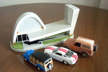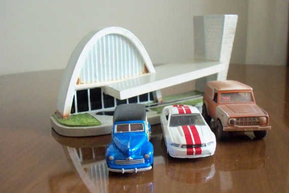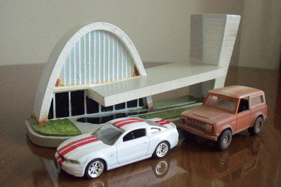 Réplica da Igreja de São Francisco de Assis (Igrejinha da Pampulha), em BH; estacionados, dois Fords: Mustang GT 2010 e Bronco 1973 (escalas 1:64)