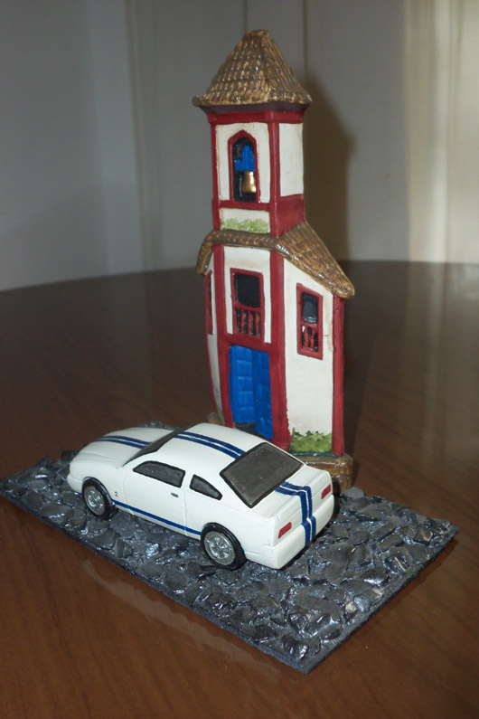 Réplica da Igreja de Nossa Senhora do Ó, em Sabará; no detalhe, a passeio na cidade, um Ford Mustang Shelby GT 500 2007 (resina)