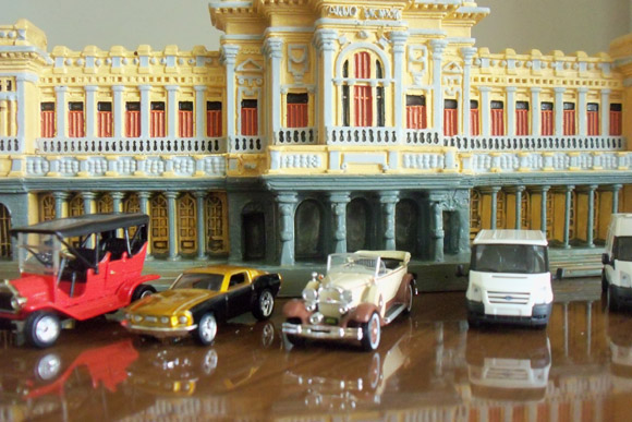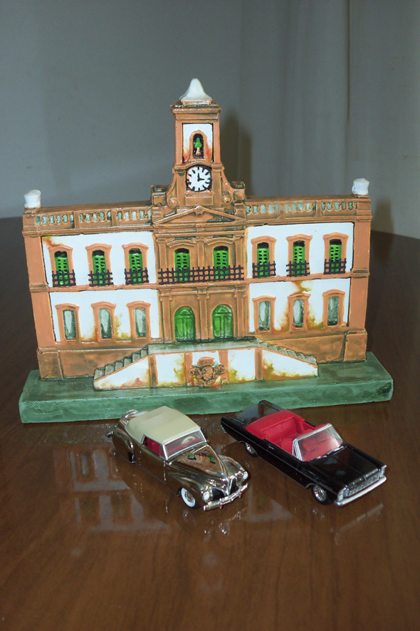 Réplica do Museu da Inconfidência, em Ouro Preto; no detalhe, dois Fords - um Lincoln Continental 1941 (esq.) e um Galaxie conversível 1965 (escala 1:64); o Museu da Inconfidência é um museu histórico e artístico que ocupa a antiga Casa de Câmara e Cadeia de Vila Rica e mais quatro prédios auxiliares na cidade. O Museu é dedicado à preservação da memória da Inconfidência Mineira (1789), movimento pela Independência do Brasil baseado na Independência americana. Localiza-se na Praça Tiradentes, em frente ao monumento a Joaquim José da Silva Xavier, principal e mais famoso ativista da Inconfidência.