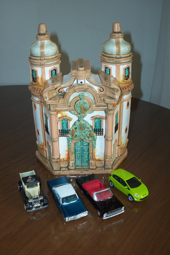 Réplica da Igreja de São Francisco de Assis, em Ouro Preto; no detalhe, quatro Fords em frente ao imóvel: Picape 1929, Galaxie 500 1964, Galaxie 1965 e New Fiesta 2012 (escalas 1:64); a Igreja foi construída em estilo rococó, e foi classificada em 2009 como uma das Sete Maravilhas de Origem Portuguesa no Mundo; sua construção teve início em 1766, com projeto arquitetônico, risco da portada e elementos ornamentais como púlpitos, retábulo-mor, lavabo e teto da capela-mor de autoria de Antônio Francisco Lisboa, o Aleijadinho, e Manuel da Costa Ataíde, considerados os dois nomes mais importantes da arte colonial brasileira.