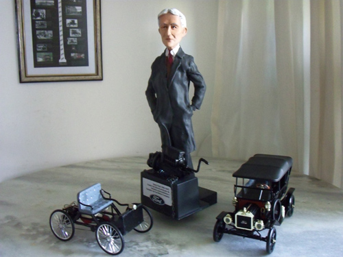 Réplica em resina de Henry Ford; detalhe para as miniaturas do motor do Ford Modelo T, do Ford Quadriciclo e do Ford Modelo T Touring 1913