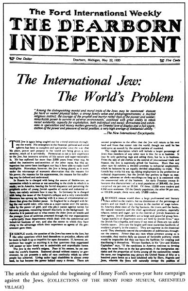Cópia de um dos primeiros artigos escritos supostamente contra os judeus por Henry Ford nesse jornal; outros textos que se seguiram foram motivos para ações judiciais contra o magnata da Ford